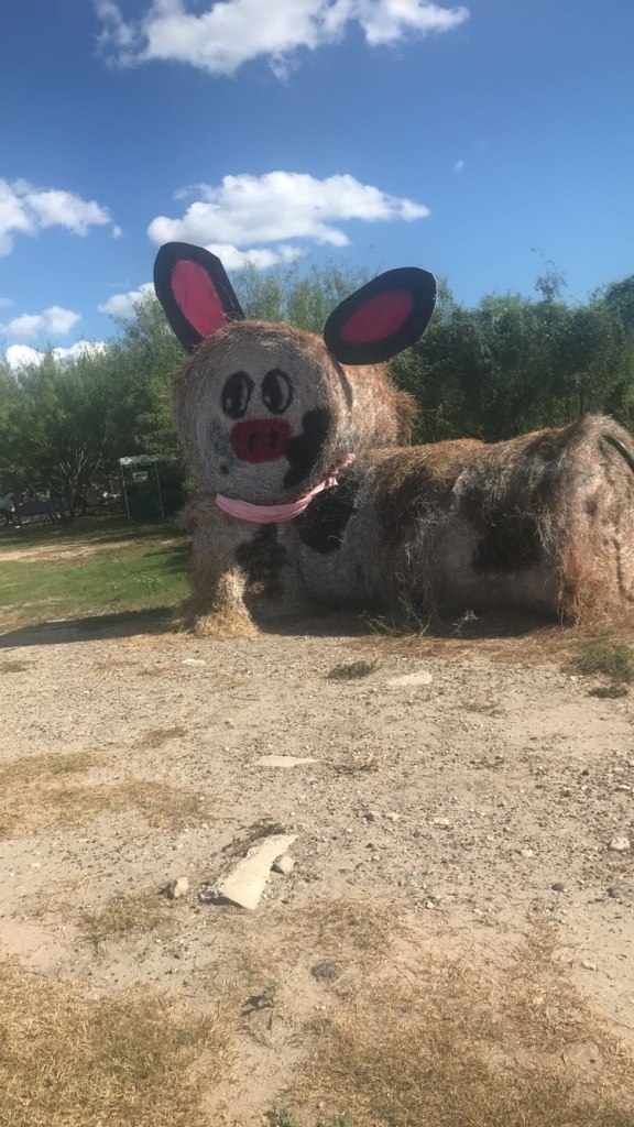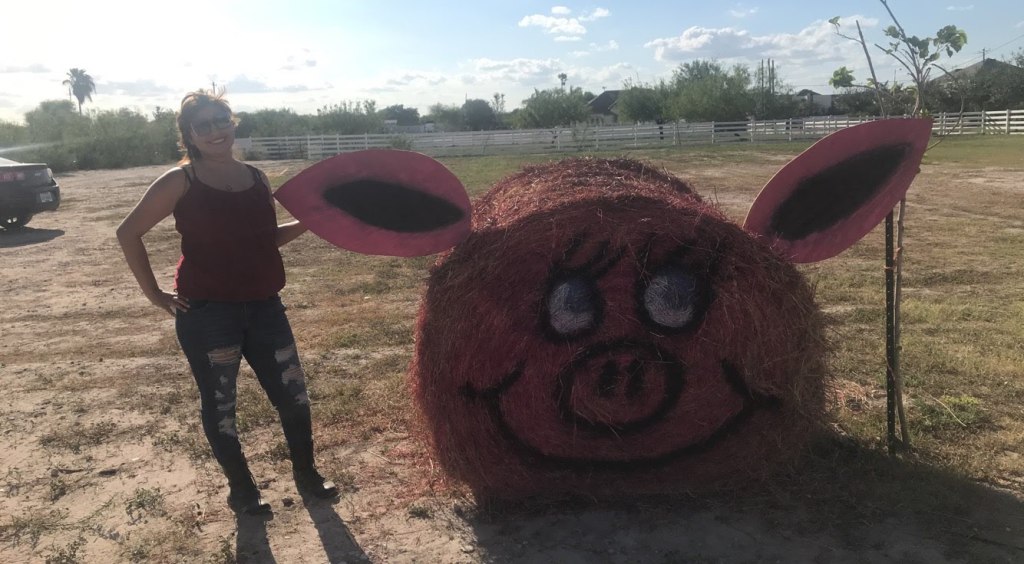 Once we got out of the car we noticed the huge hay bales have been decorated as pigs and cows. We took a couple of pictures with them because they looked cute. We saw the main historical looking house in the middle of the patch which was also decorated with plenty of pumpkins and a tractor out front. There was also a wagon with hay bales that were placed in front of the house for pictures to be used for photos if the customers want to sit on them.